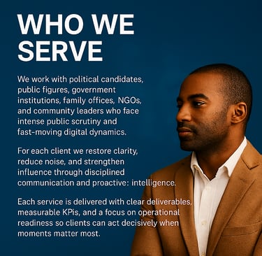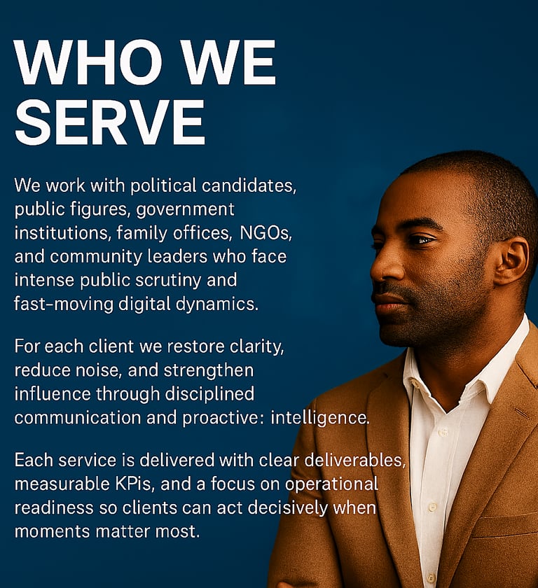 We are a strategic communications and digital intelligence firm that helps public figures, political campaigns, institutions, family offices, and organizations navigate today’s fast‑moving media environment. We combine narrative design, rapid response capability, and continuous digital monitoring to keep leaders ahead of shifting stories and emerging risks. Our approach is practical, evidence‑based, and built for speed.